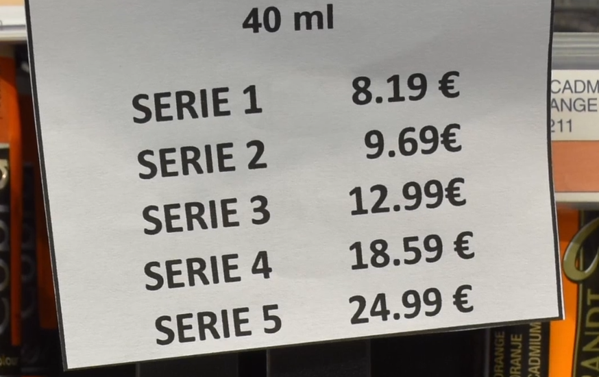 Les pigments les plus courants sont classés en Série 1, tandis que les pigments rares et coûteux se retrouvent dans les séries plus élevées. Ainsi, un tube de Série 1 peut coûter 5 €, alors que le même format en Série 6 peut atteindre 35 €. Mais alors, pourquoi cette notion de série ne s'applique-t-elle pas aux peintures fines ? Tout simplement parce que la quantité de pigment qu'elles contiennent n'est pas suffisamment importante pour impacter le prix final du tube. Rassurez-vous : dans la plupart des gammes extra-fines, plus de la moitié des couleurs sont en Série 1.