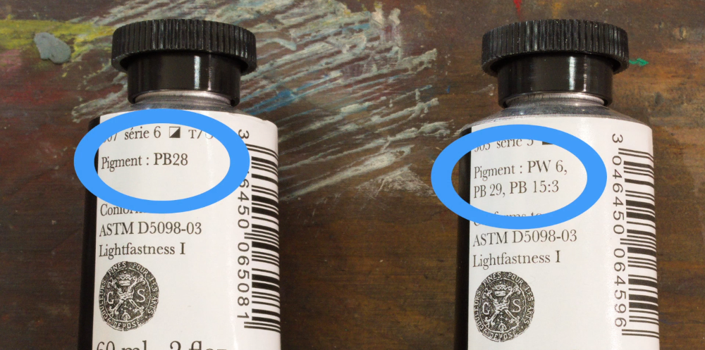 Prenons l'exemple d'un Bleu de Cobalt. Le tube "véritable" est fabriqué avec le pigment unique de cobalt, rare et cher. L'imitation, ou "ton", a la même nuance, mais est fabriquée à partir d'un assemblage de plusieurs pigments synthétiques moins coûteux. En apparence, les couleurs sont similaires, mais leur ADN est totalement différent, ce qui se révèle dans les mélanges.