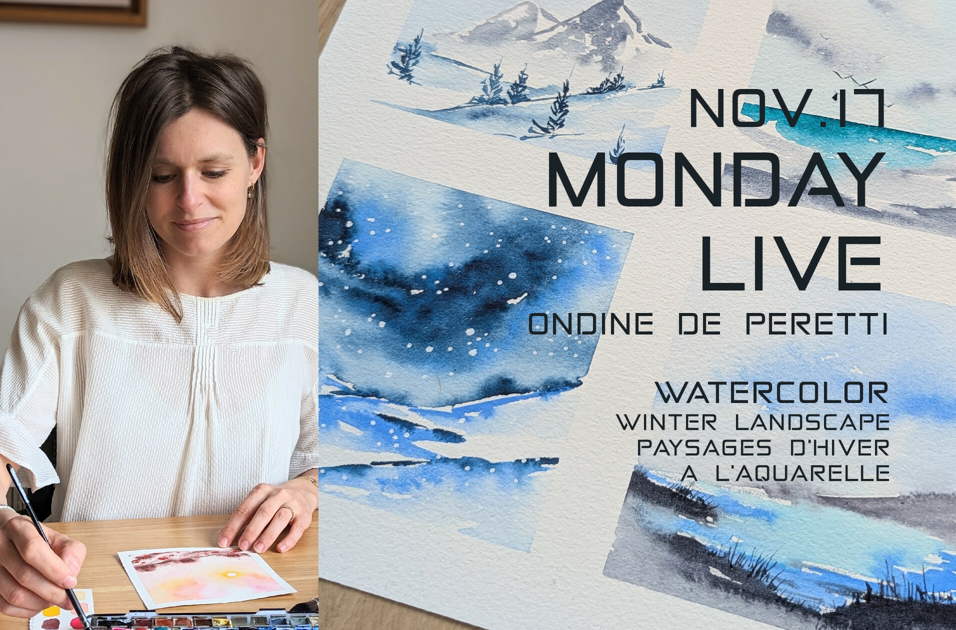 Ondine nous propose de peindre 4 mini paysages d'hiver pour découvrir différentes techniques à l'aquarelle. Nous créerons des textures, des fusions et manierons les bleus pour composer des ambiances froides et créer un joli ensemble.
