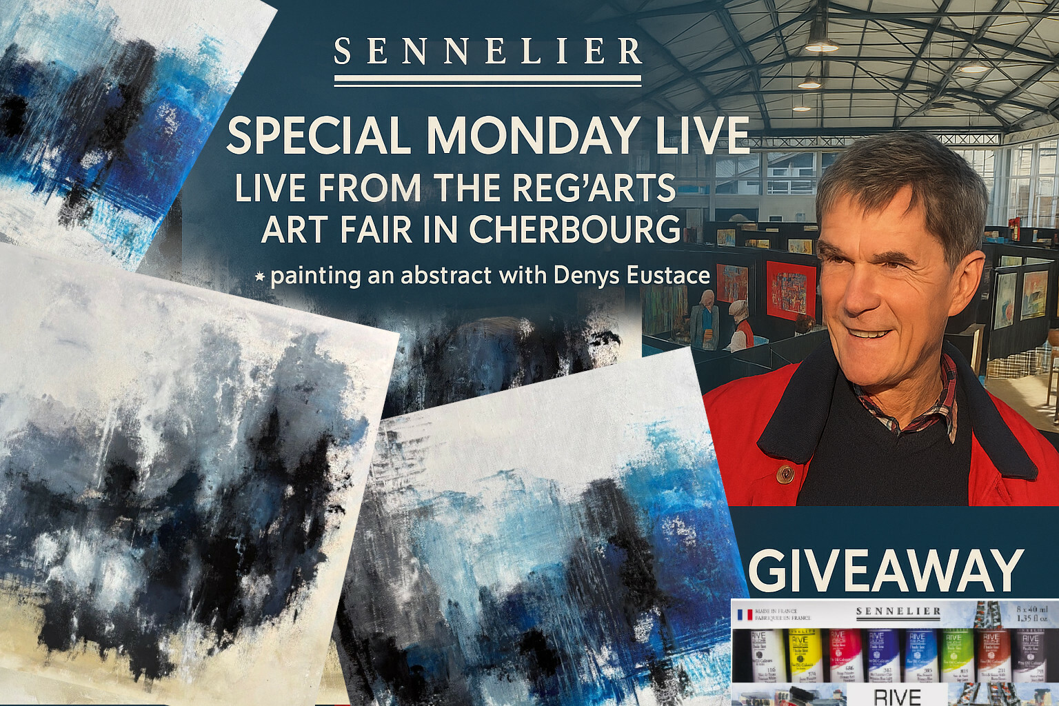 Le mercredi 24 septembre à 17h (Heure française), retrouvez Yves-Marie en direct du salon Reg’Arts de Cherbourg pour un Live exceptionnel. Il sera accompagné de Denys Eustace, invité d’honneur du salon, qui réalisera sous vos yeux une œuvre abstraite à l’huile fine Rive Gauche de Sennelier avec des couteaux à peindre.
